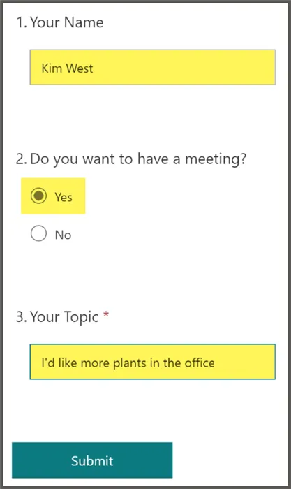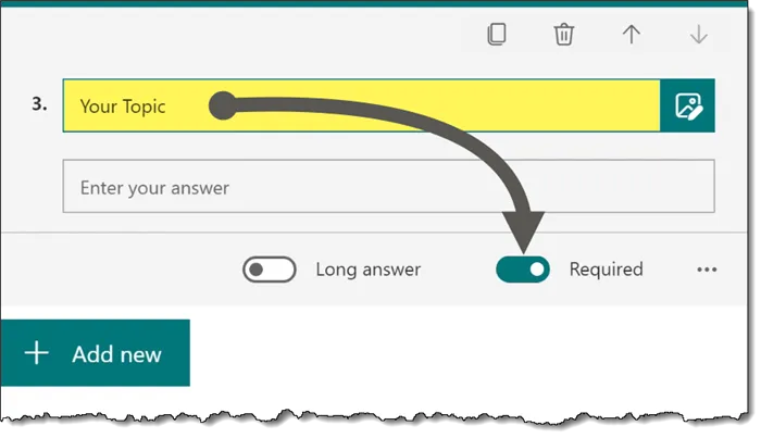 Lastly, we want to find out what the meeting is about, so we’ll create another Text-based question labeled “Your Topic”. We want this question to be a required response, so set the Required option to On.