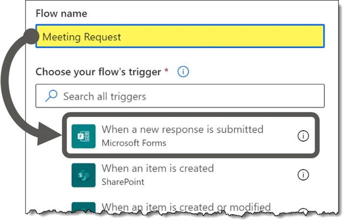 We’ll name our Flow “Meeting Request” and select the trigger option “When a new response is submitted” using Microsoft Forms.
