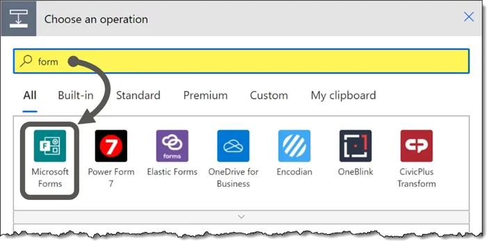 In the Choose an Operation panel, type the word “form” in the Search panel, then select Microsoft Forms from the list of returned apps.
