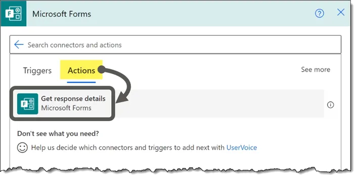 If necessary, select the Actions panel to reveal all Microsoft Forms actions.