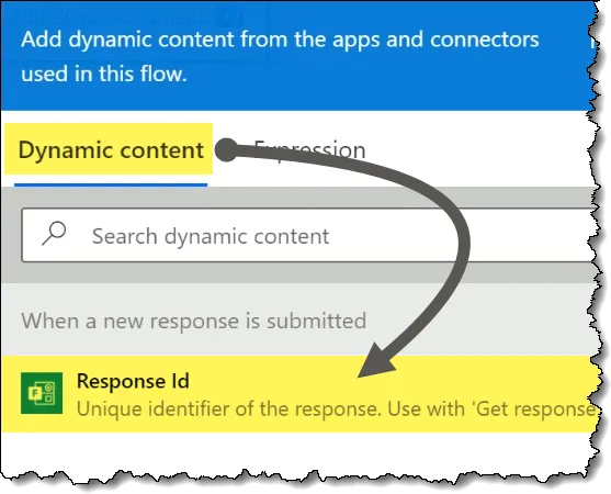 For the Response ID, clicking the field reveals the Dynamic Content list. We have but one option labeled Response ID.