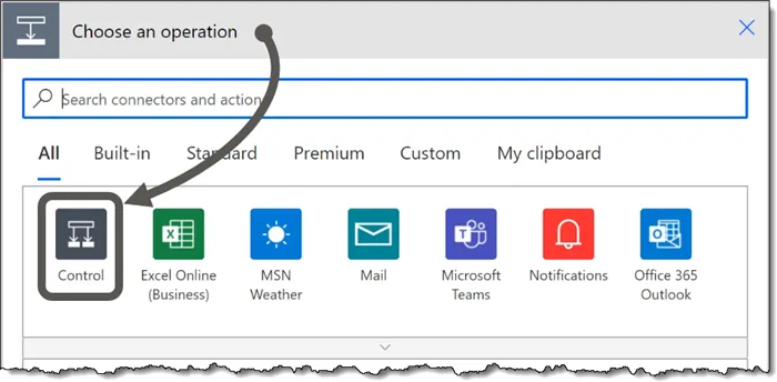 Click the New Step button to open the Choose an Operation panel and select Control.