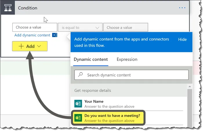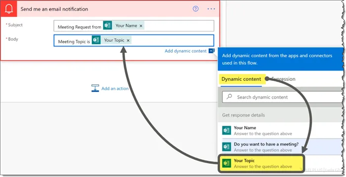 Now set the Body to be “Meeting topic is” then from the Dynamic Content panel, select “Your Topic” from the list of form questions.
