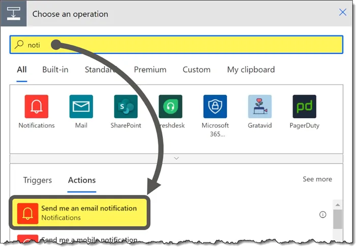 We want to receive an email notification. In the Search bar, type “noti” which should be enough to display the “Send me an email notification” option.