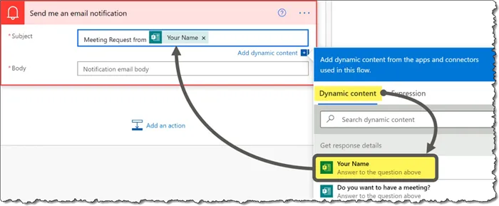 In the Send me an email notification panel, set the Subject to be “Meeting request from” then from the Dynamic Content panel, select “Your Name” from the list of form questions.
