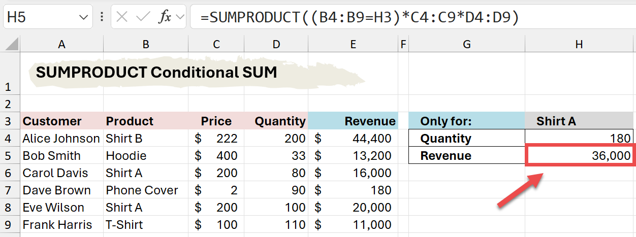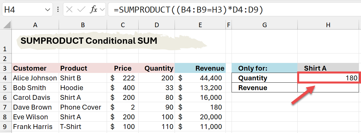 - Summing the Results: SUMPRODUCT then sums these converted values, effectively summing only the quantities where the product is ‘Shirt A’.