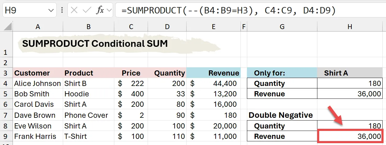 To calculate the revenue for ‘Shirt A’ using the double negative method, extend the SUMPRODUCT formula like this: