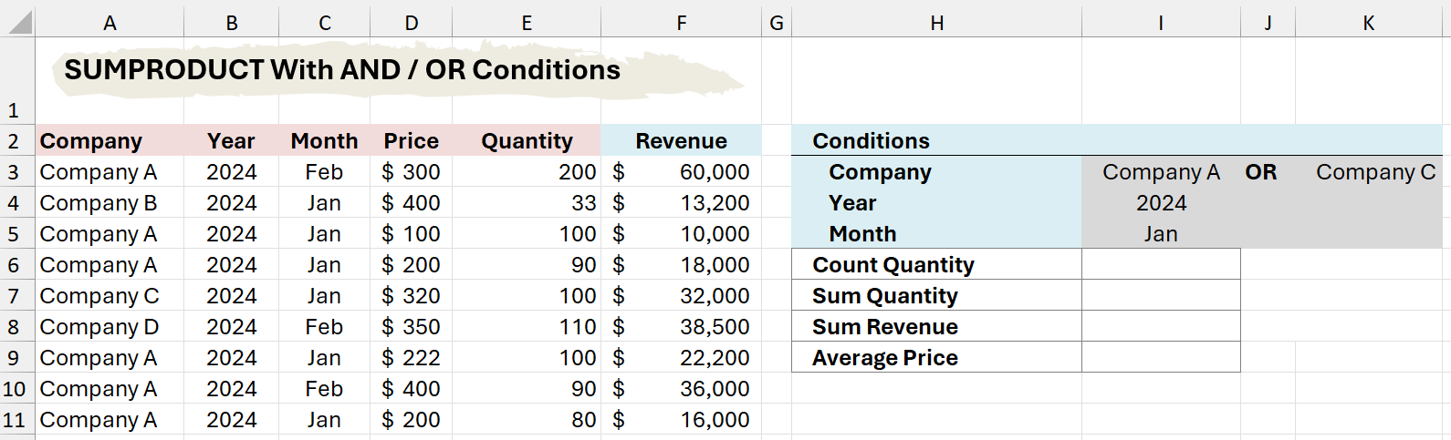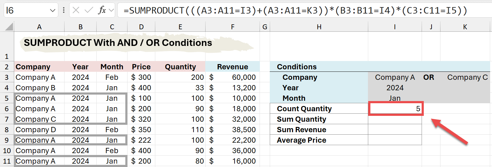 Let’s say you want to count instances where the company is “Company A” (in cell I3) or “Company C” (in cell K3), the year is 2024 (in cell I4), and the month is January (in cell I5).