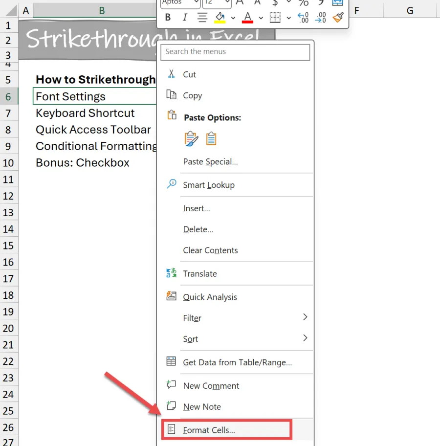 Let’s look at different methods of how to strikethrough in Excel.
