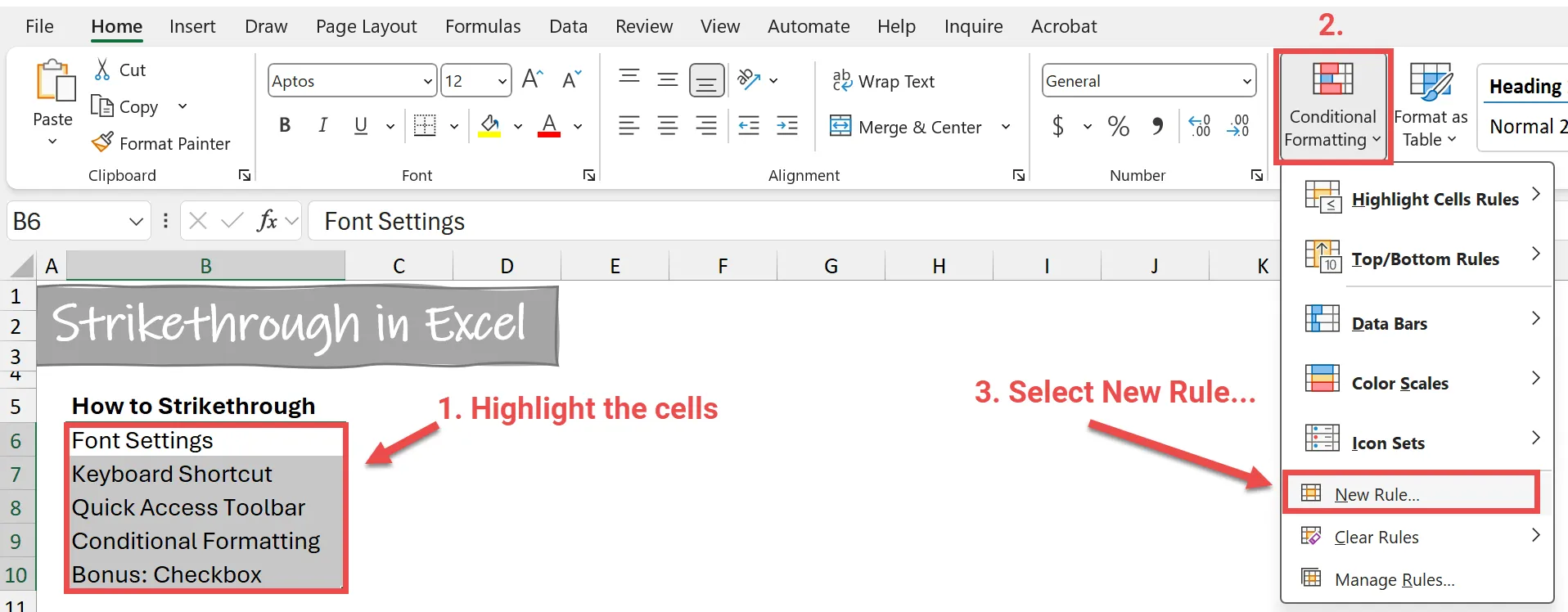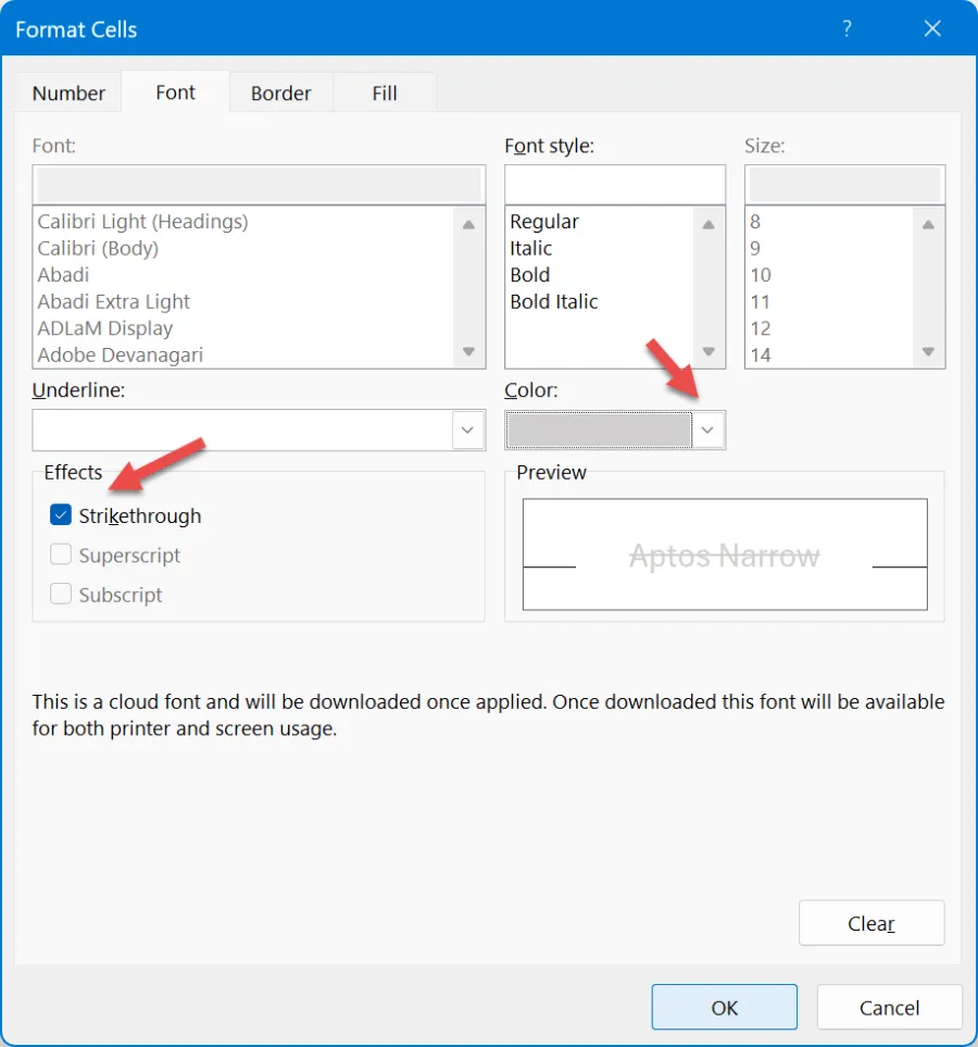 - Check the “Strikethrough” box. Optionally, you can make other formatting changes, such as setting a light grey font color for crossed-out entries.