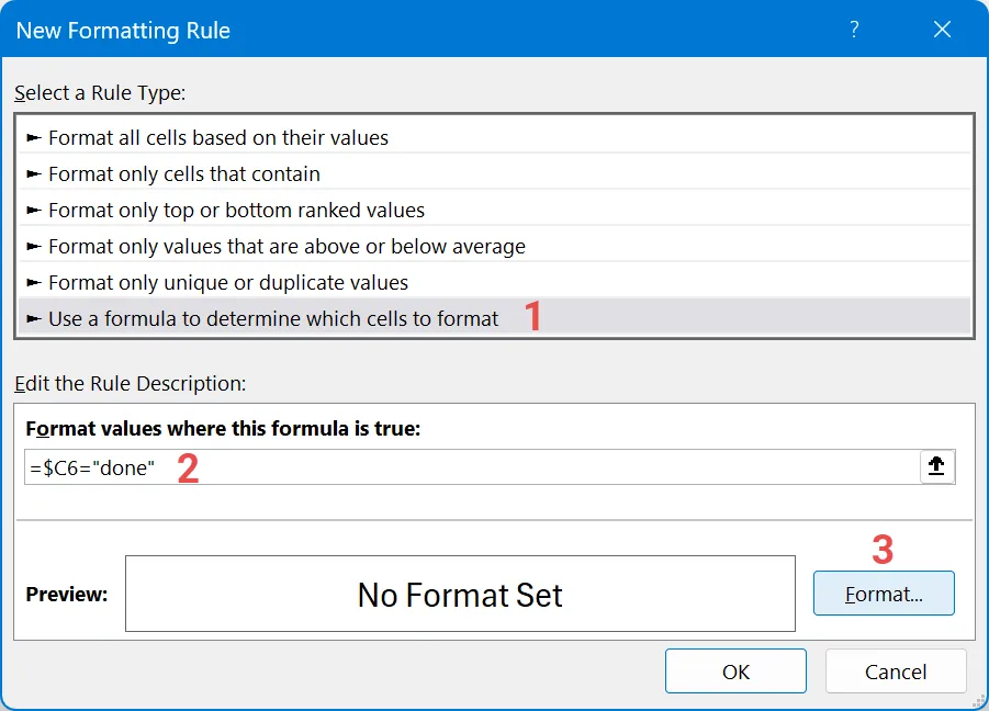 =$C6="done"💡 The dollar sign before the column letter ($C) locks the column in place, even if you move or copy the formula. This lets the row number change while keeping the column fixed. Want to learn more about Excel cell referencing? Read our full guide here.