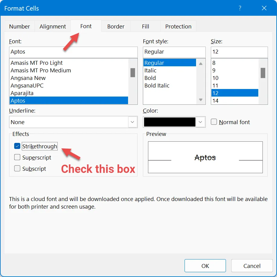 - Check the “Strikethrough” box.