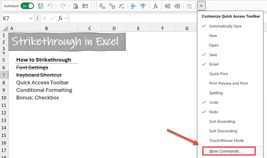 Another quick solution is to add a Strikethrough button to the Quick Access Toolbar (QAT) on the Excel ribbon. This makes strikethrough formatting just a click away.