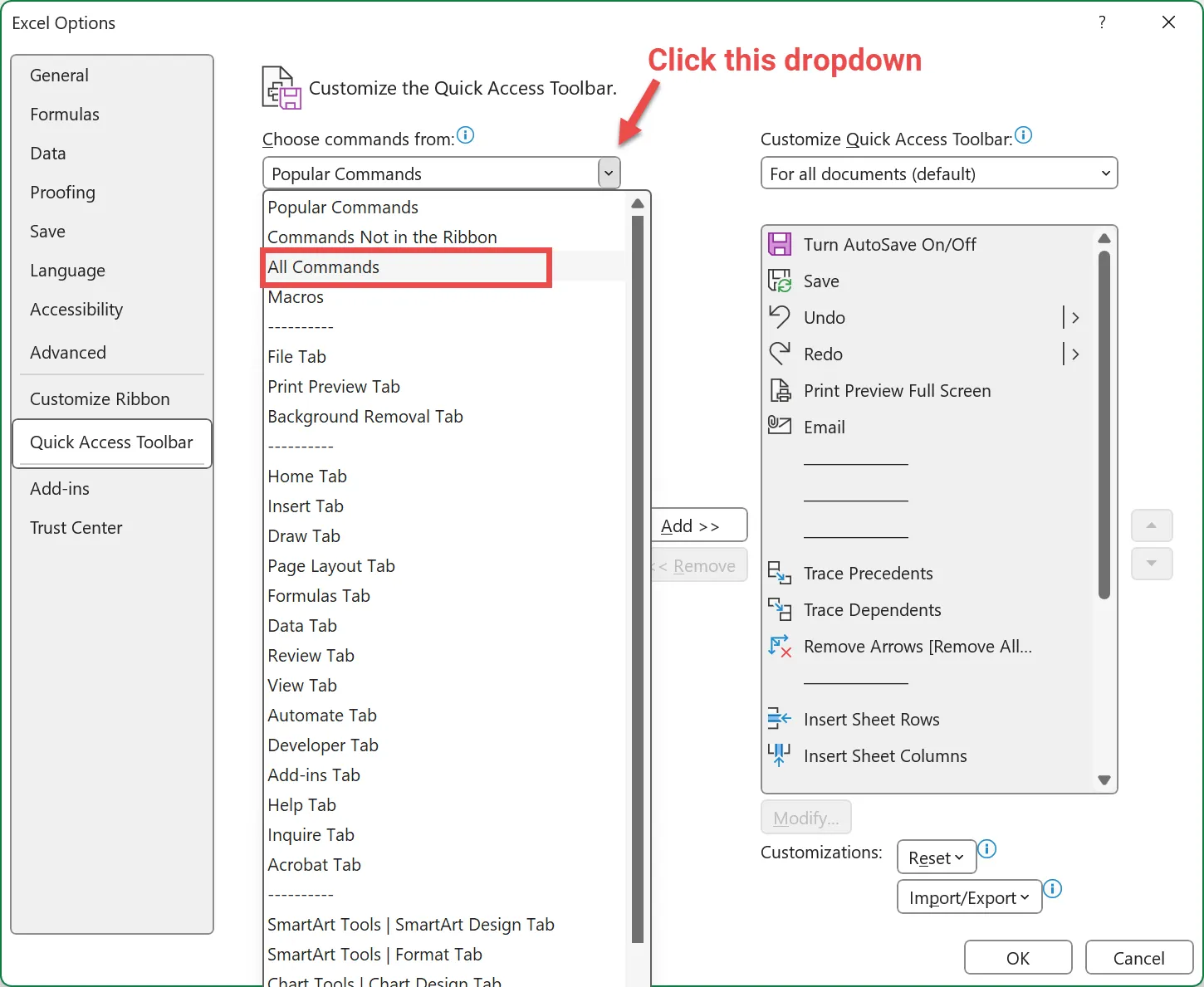 - In the Excel Options menu, set the “Choose commands from” dropdown to “All Commands.”