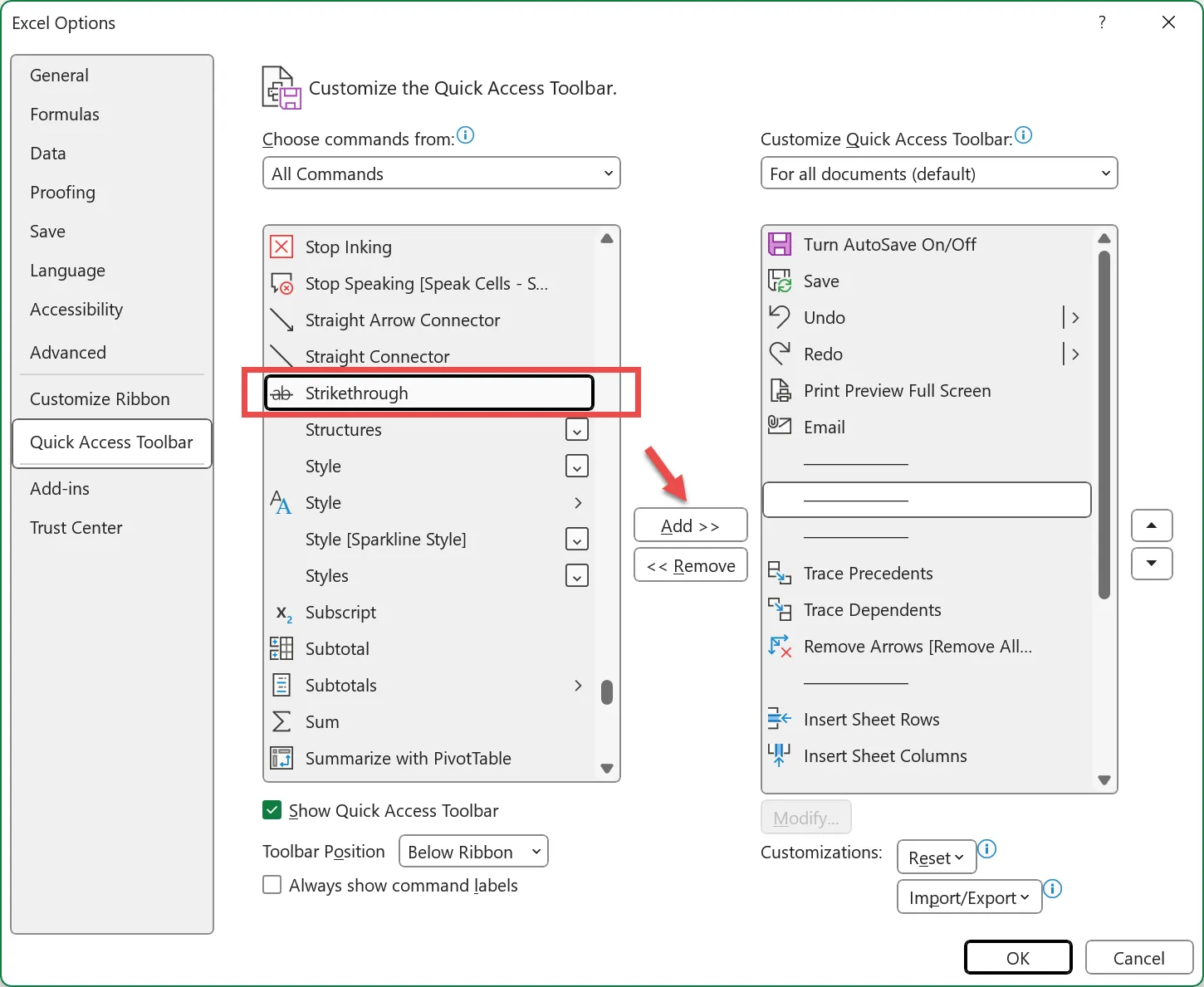 - Scroll down the list, select “Strikethrough”. Then click the “Add” button to move it to the QAT.