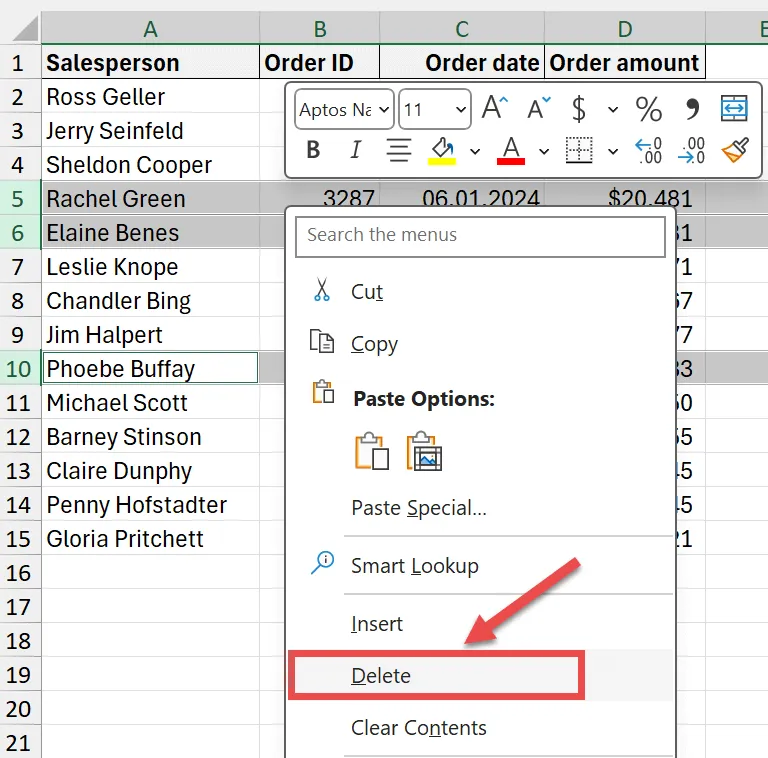 Ctrlkey while clicking the row numbers to select them individually. - Remove Blank Rows: Right-click the selected row number(s) and choose “Delete” from the context menu.