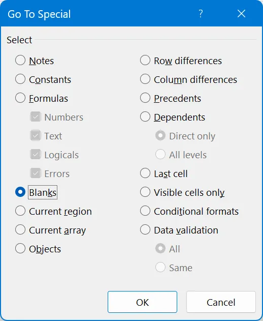 - Select Blanks: Choose “Blanks” and click “OK.”