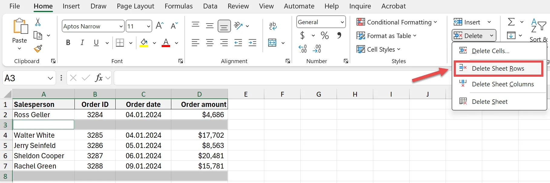 - Remove Blank Rows: Go to the “Home” tab, click “Delete,” and choose “Delete Sheet Rows.”