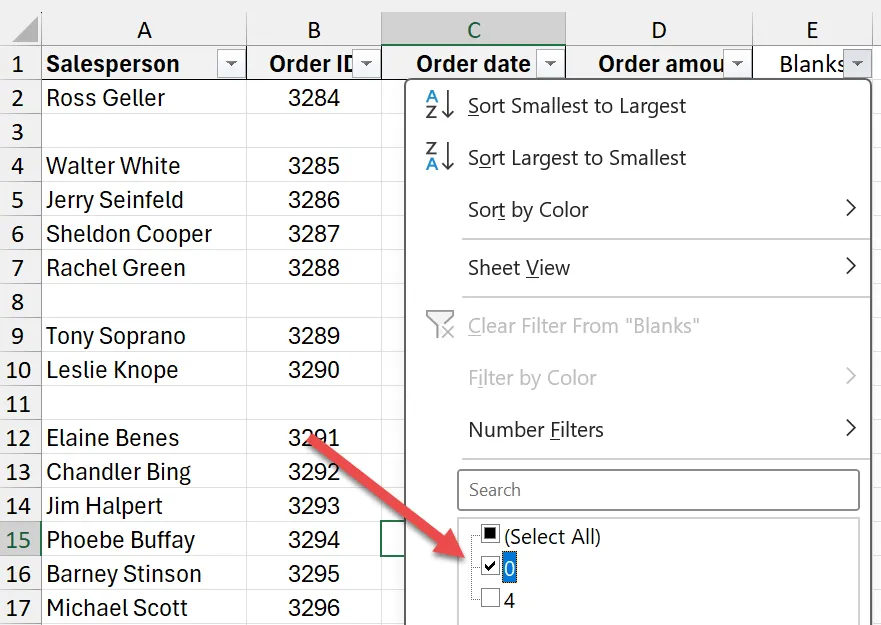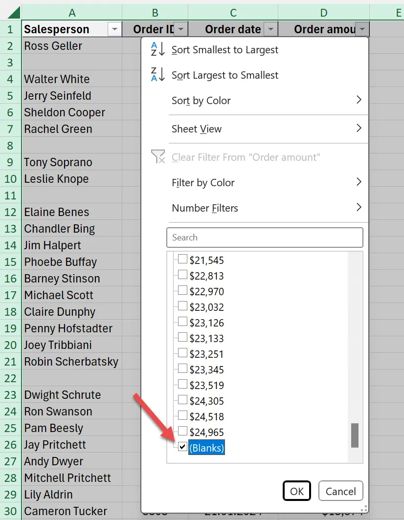 - Filter Blank Rows: Click the filter arrow, uncheck “Select All,”. Then scroll down to the end of the list, and check the ‘Blanks’ option. Click on ‘OK’.