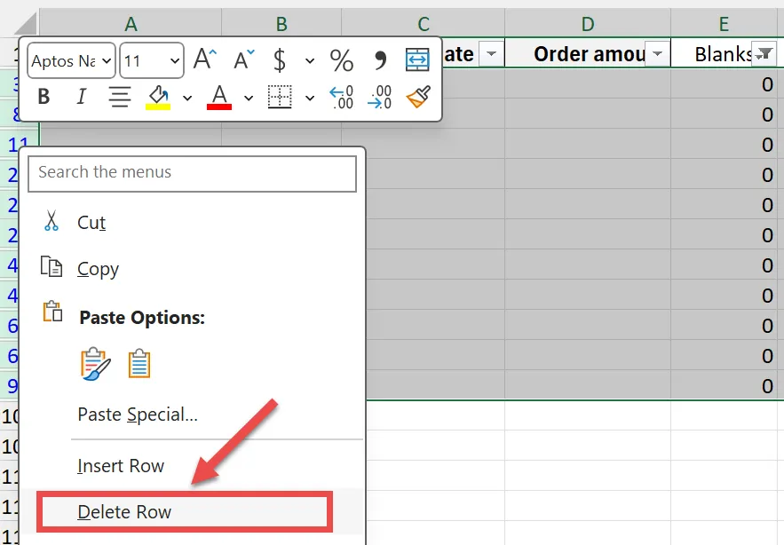 - Delete Empty Rows: Select the rows with a value of 0, right-click, and choose “Delete Row.”
