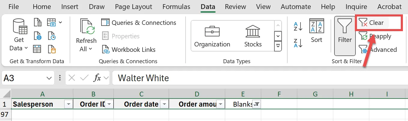 - Clear the Applied Filter: Go to the “Data” tab and press the “