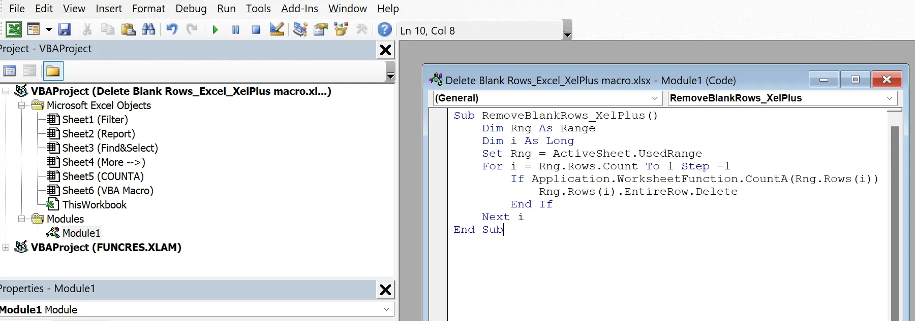 If the count is zero, meaning the row is completely blank, the macro deletes that row. This loop runs from the bottom of the used range to the top to avoid issues with shifting rows.