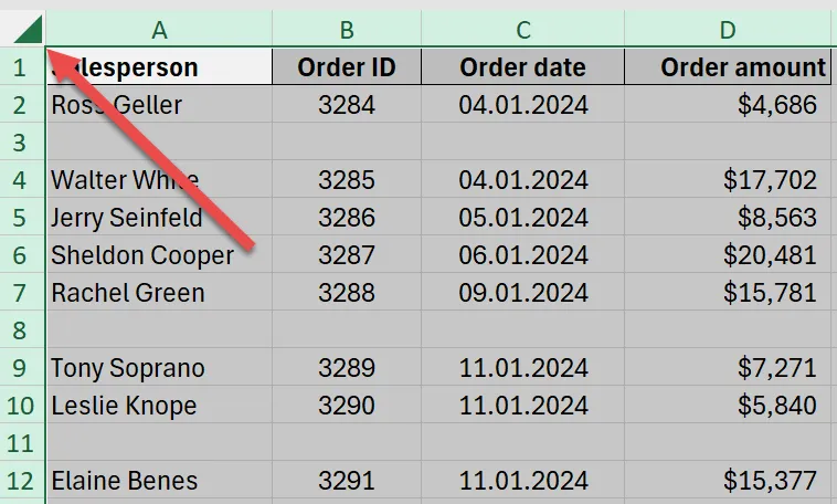 - Select All Data: Click the top-left corner of your sheet to select all cells.