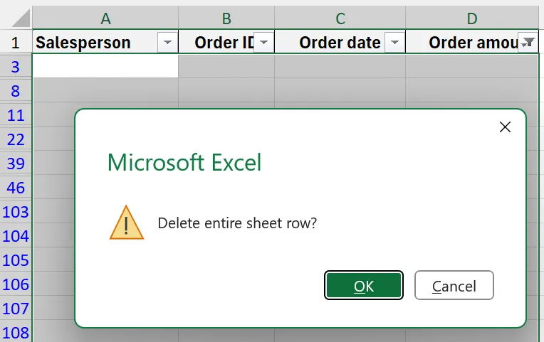 - Click OK in the “Delete entire sheet row?” dialog box.
