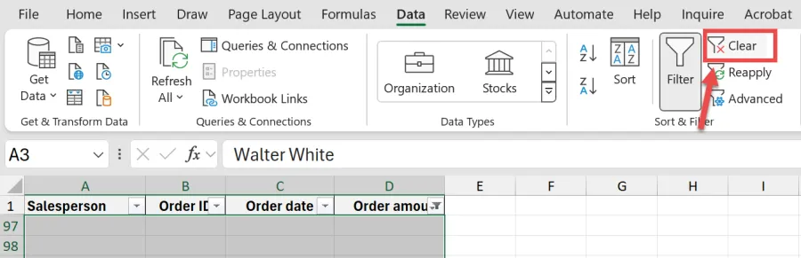 - Clear the Applied Filter: Go to the “Data” tab and press the “Clear” button to remove the filter.