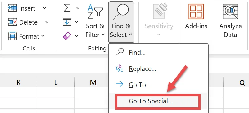 - Open Find & Select: Go to the “Home” tab, click “Find & Select,” and choose “Go To Special…”