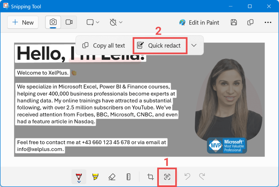 - Redact text in image: Click ‘Quick Redact‘. The tool will automatically cover up email addresses and phone numbers. You can also choose what to hide by using the dropdown menu next to ‘Quick Redact’.
