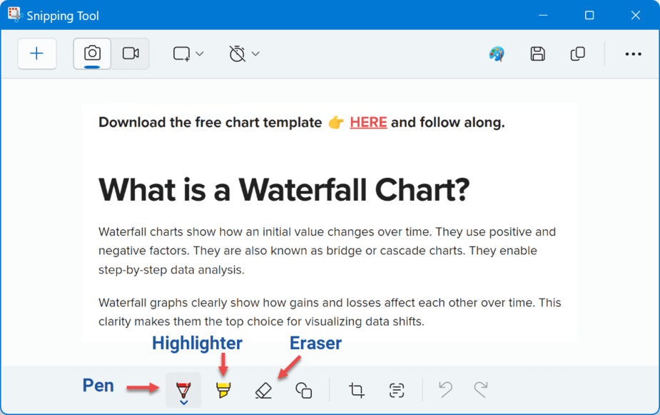 - Open the Annotation Tools: Once you capture the screenshot, it automatically appears in the Snipping Tool window. You’ll find a toolbar with several tools for annotating your screenshot: