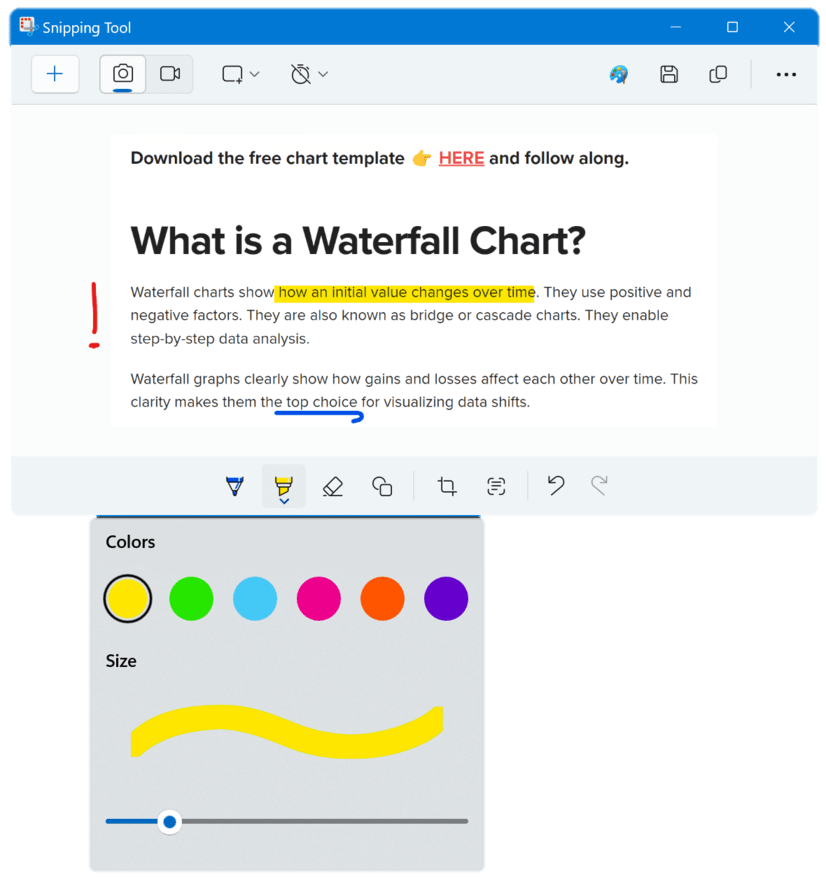 The Snipping Tool lets you add shapes, notes, highlights, and other marks to your screenshots. It’s useful for underlining parts, adding explanations, or highlighting details.