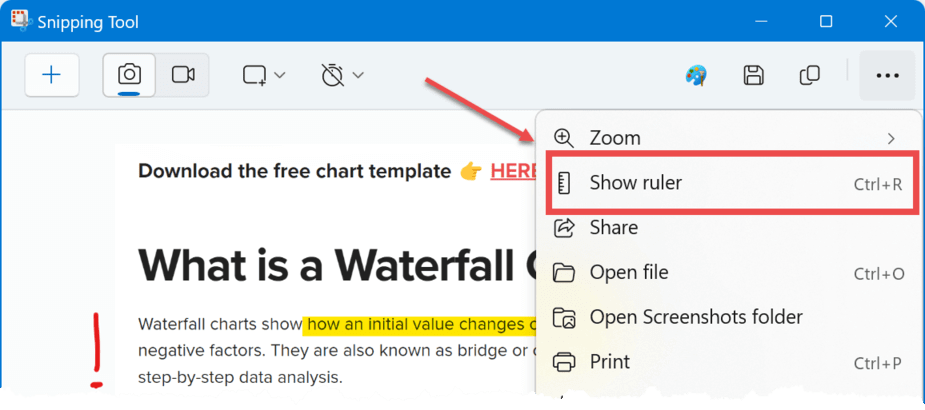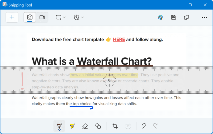 The Snipping Tool also offers Ruler and Protractor tools. They are very useful for drawing straight lines or measuring length and angles on your screenshots.