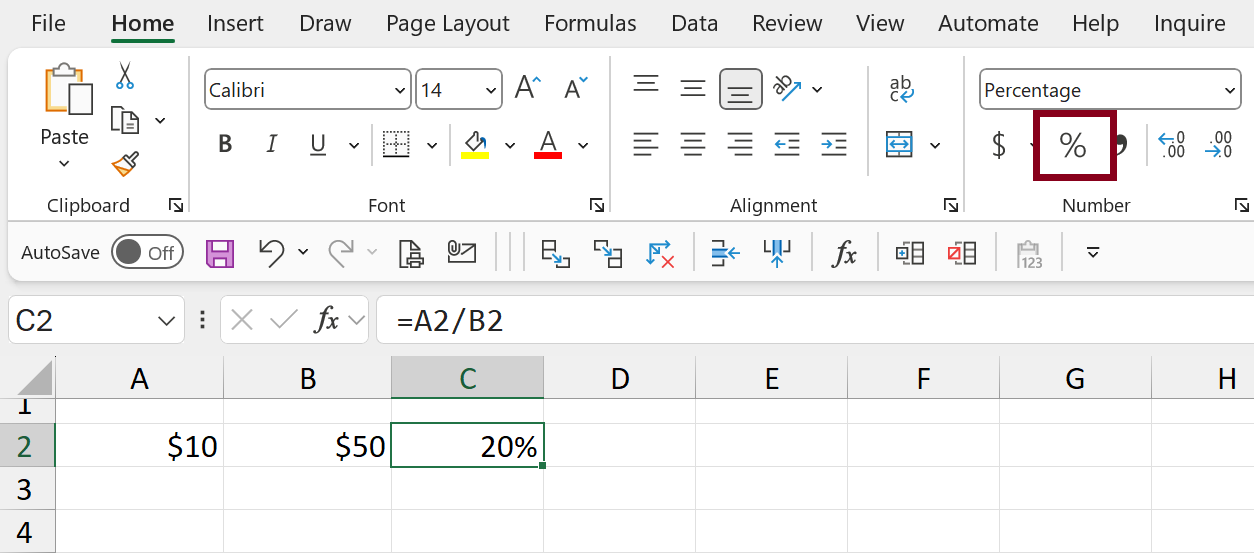 - Format as Percentage: Once the formula is filled in, select all the cells with the percentage formula and format them as percentages. To do this, go to the ‘Home’ tab, find the ‘Number’ group, and click on the ‘Percentage Style’ button. This will convert the formula results into a percentage format.