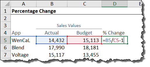 =B5/C5-1Here, B5 represents the actual value and C5 the budget value.
