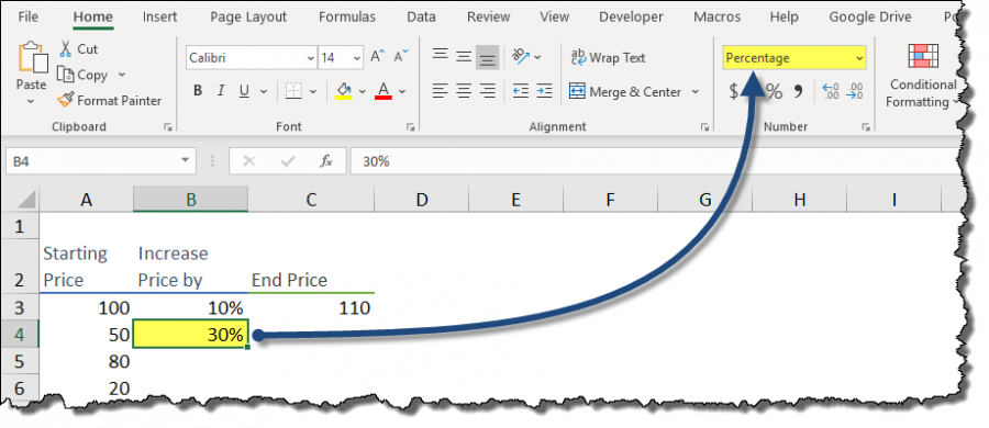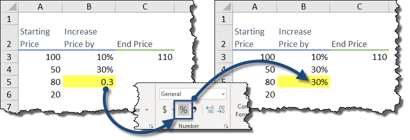 If you prefer, you can enter a decimal number (e.g., 0.30 for 30%) and then manually apply the Percentage style.