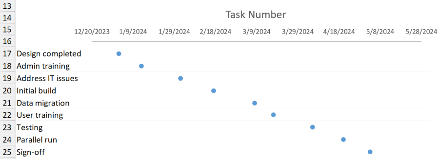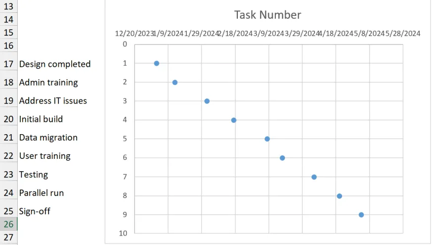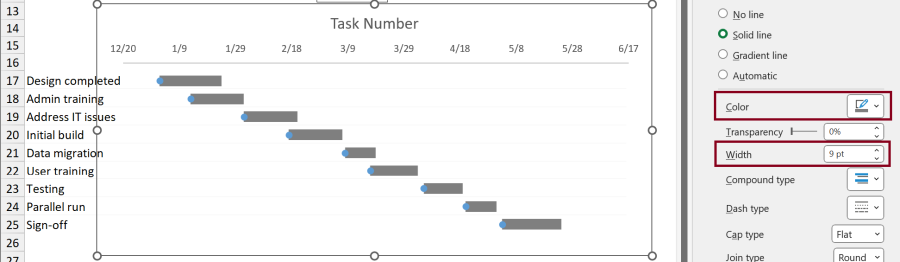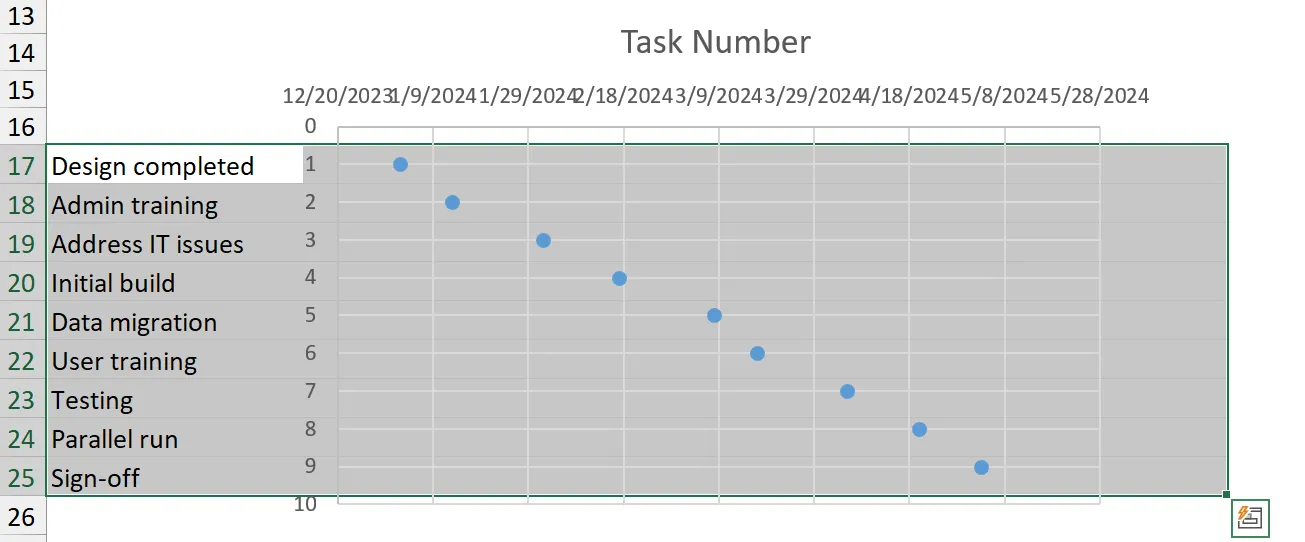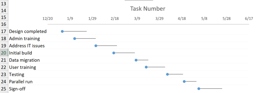 Let’s turn our project timeline into a Gantt chart using a Scatter Plot, which offers several advantages over the typical bar chart approach: