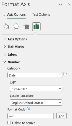 - Simplify the X-axis by removing the year to avoid clutter. Double-click the X-Axis to go to the Axis options, choose Number, and untick ‘Link to Source’ formatting. Change the Format Code to show only the month and day, like this: m/d. Then click on Add to confirm.