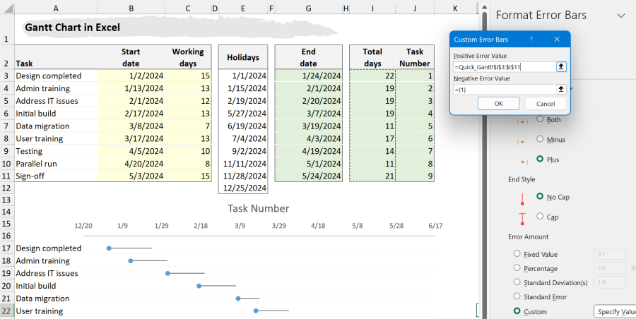 This method quickly integrates the project’s timeline into your Excel Gantt Chart.