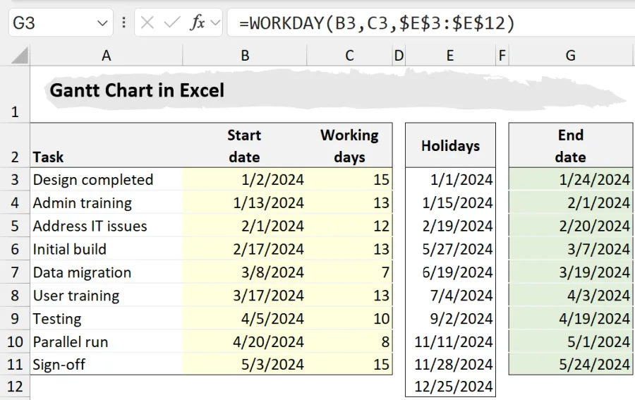 =WORKDAY(B3, C3, $E$3:$E$12)This formula starts with your task’s start date, adds the number of workdays you’ve set for the task, and avoids any dates listed as holidays. Once you’ve got it set up for the first task, you can copy this formula to the rest of your tasks easily.