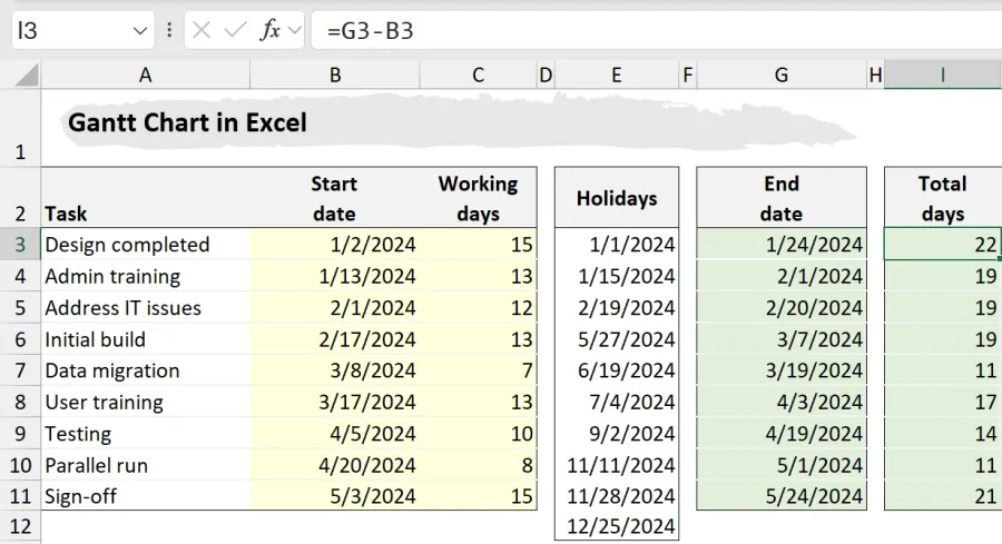 Next, We’ll figure out how many days each task will take by subtracting the start date from the end date. For instance, for the ‘Design completed’ task, subtract the start date (B3) from the end date (G3).