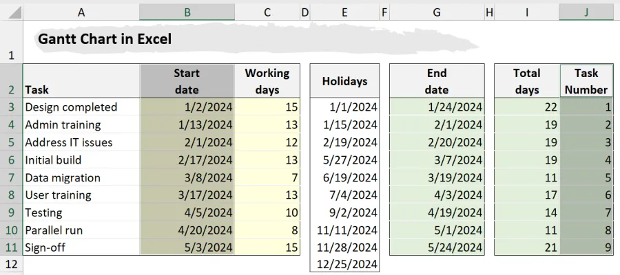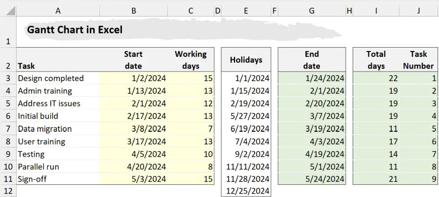After setting your start date and task duration, the next step is to calculate the end date for each task, making sure to skip over weekends and any holidays your project will observe. For holidays, you’ll list them separately.