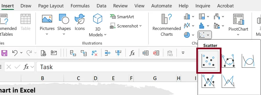 Then in the Excel ribbon, click on Insert and then select Scatter.