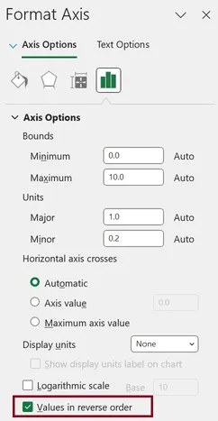 To fix this, double-click the Y-axis (0 to 10). This opens the Axis Options. Select ‘Values in Reverse Order‘ to invert the order.