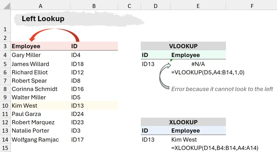 - VLOOKUP fails ❌ because it can’t search left (Column A is to the left of Column B).