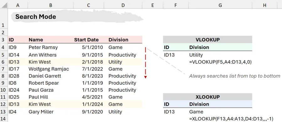 By default, VLOOKUP always searches from top to bottom and stops at the first match it finds. This can be a problem when working with historical data, price changes, or employee job history.