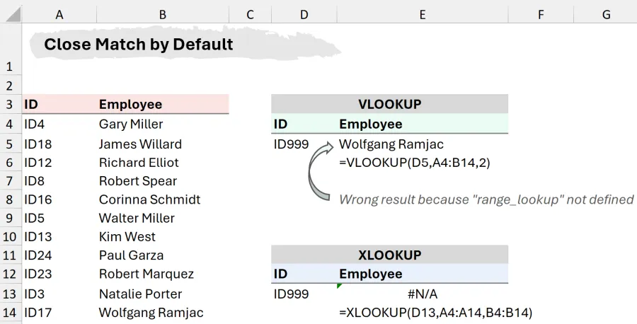XLOOKUP avoids this problem by using exact match as the default. If it doesn’t find the value, it simply returns an error or a custom message—not the wrong data.