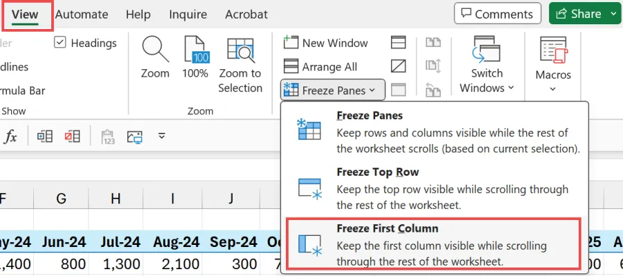 Simply navigate to “View,” select “Freeze Panes,” and then click on “Freeze First Column.”