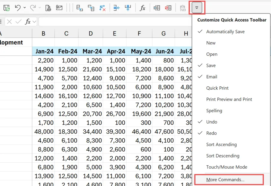 - Click the small dropdown arrow on the Quick Access Toolbar and select “More Commands“: